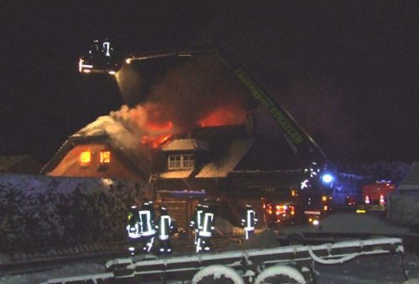 Beim Eintreffen der Feuerwehr befanden sich der Hauseigentümer auf dem spiegelglatten Dachstuhl und versuchte verzweifelt den Brand im Spitzboden zu bekämpfen. Er konnte mit dem Hubrettungsfahrzeug der Feuerwehr vom Dach gerettet werden.