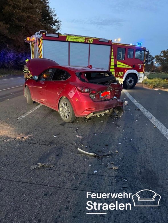 Straelen (ots) - Am Mittwoch (5. November 2025) kam es gegen 17:00 Uhr an der Xantener Straße (B58) in Straelen zu einem Verkehrsunfall. Eine 39-jährige Verkehrsteilnehmerin aus Kevelaer wartete, mit einem roten Mazda 3, vor einer roten Lichtzeichenanlage in Fahrtrichtung Venloer Straße. Zum gleichen Zeitpunkt befuhr ein 84-jähriger Mann aus Geldern mit einer grauen Mercedes A-Klasse, in welcher sich auch eine 80-jährige Beifahrerin aus Geldern befand, die Straße in die gleiche Fahrtrichtung. Aus bislang ungeklärter Ursache nahm der Mann aus Geldern die voraus wartende Verkehrsteilnehmerin zu spät wahr und kollidierte mit dem Fahrzeug der 39-Jährigen. Durch die Kollision zogen sich die Frau aus Kevelaer sowie der Gelderner schwere- und die Frau aus Geldern lebensgefährliche Verletzungen zu. Alle drei beteiligten Personen wurden ins Krankenhaus verbracht, während die Fahrzeuge so stark beschädigt wurden, dass diese nicht mehr fahrbereit waren. (pp)