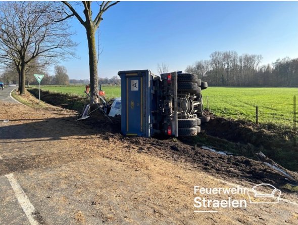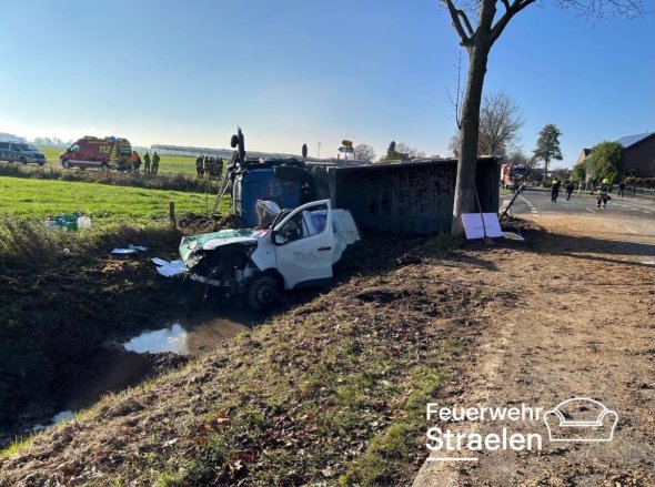 Straelen (ots) - Bei dem schweren Verkehrsunfall in Straelen-Hetzert am heutigen Freitag (21. November 2025) gegen 10:40 Uhr wurden zwei Personen schwer verletzt, bei einem Fahrer besteht Lebensgefahr. Nach derzeitigem Erkenntnisstand hat ein 40-jähriger Mann aus Mönchengladbach, der mit seinem Renault Traffic auf der Niersstraße in südlicher Richtung fuhr, an der Kreuzung mit der Hetzerter Straße das dortige STOP-Zeichen missachtet. Im Kreuzungsbereich kam es zum Zusammenstoß mit dem LKW eines 27-jährigen Mannes aus Straelen, der die Hetzerter Straße in Richtung Kerken befuhr. Beide Fahrzeuge kamen infolge der Kollision hinter der Kreuzung nach rechts von der Fahrbahn der Hetzerter Straße ab. Der Lkw kippte dabei auf die Seite. Beide Fahrer wurden bei dem Unfall schwer verletzt, bei dem Fahrer des Transporters besteht Lebensgefahr. Er wurde mit einem Rettungshubschrauber einer Klinik in Duisburg zugeführt, der Lkw-Fahrer wurde mit dem Rettungsdienst in ein Krankenhaus eingeliefert. Ein Verkehrsunfallaufnahmeteam des Polizeipräsidiums Düsseldorf wurde angefordert und übernahm die Spurensicherung vor Ort. Der polizeiliche Opferschutz war zur Benachrichtigung und Betreuung der Angehörigen eingesetzt. Aktuell dauert die Sperrung des Kreuzungsbereiches noch an. (sp)